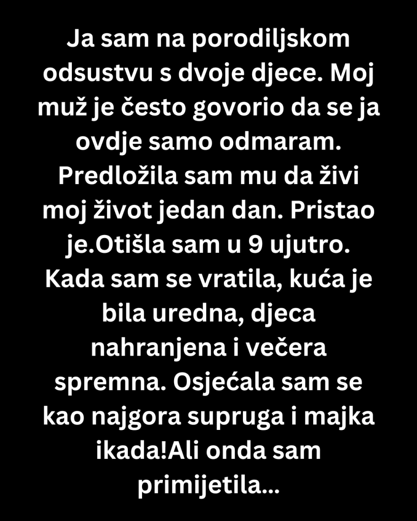 Ja sam na porodiljskom odsustvu s dvoje djece. Moj muž je često govorio da se ja ovdje samo odmaram. Predložila sam mu da živi moj život jedan dan. Pristao je.