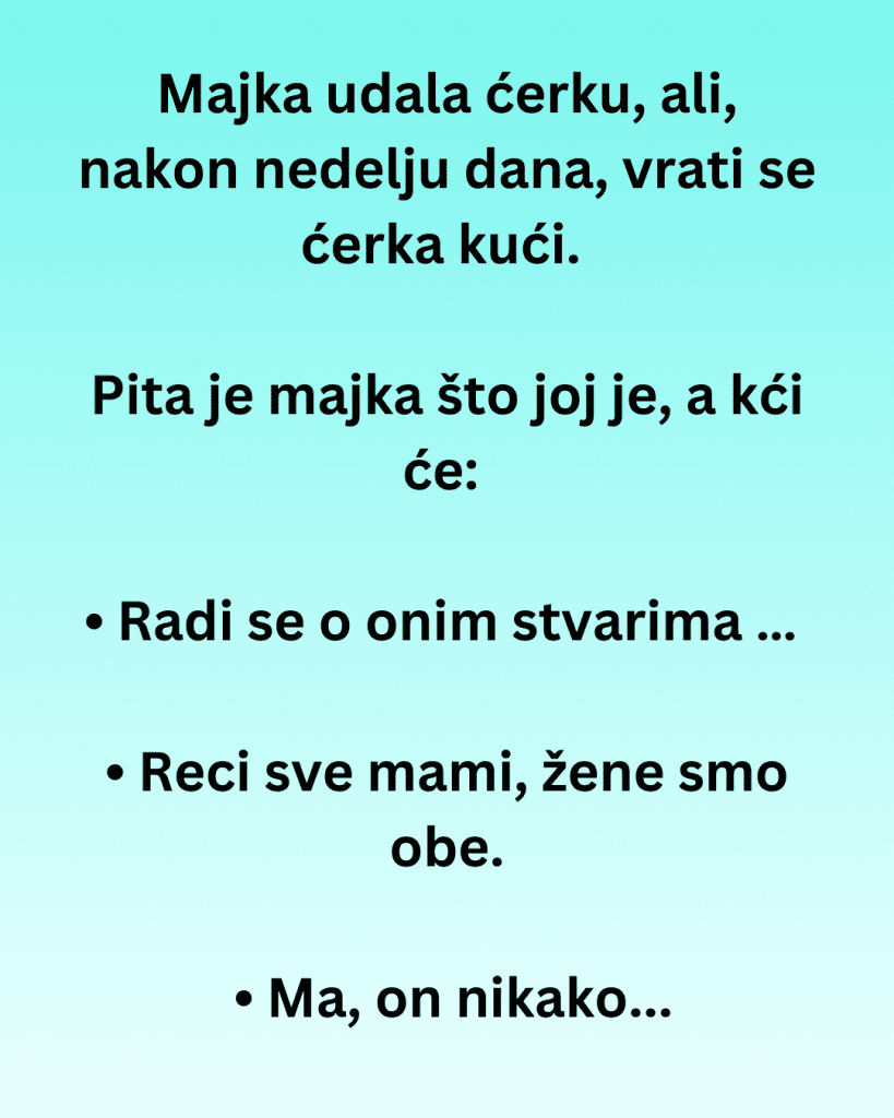 Majka udala ćerku, ali, nakon nedelju dana, vrati se ćerka kući. Pita je majka što joj je, a kći će: • Radi se o onim stvarima … • Reci sve mami, žene smo obe. • Ma, on nikako neće, samo čita knjigu. • Hajde ti natrag, doći ću ja da izvidim situaciju. Tako majka došla, a zet će joj: • Oprostite, idem u sobu da čitam knjigu. Ćerka će: • Eto vidiš, mama, o tome sam ti pričala. Na to će majka: • Daj ti meni svoju spavaćicu. Ode majka u sobu i zet joj gurne prst u pi*u. Vrati se ona kod ćerke u sobu pa kaže: • Eno, gurnuo mi je prst. Znači da hoće … • Ma, jok, to on samo da ne liže prst kad lista stranice.
