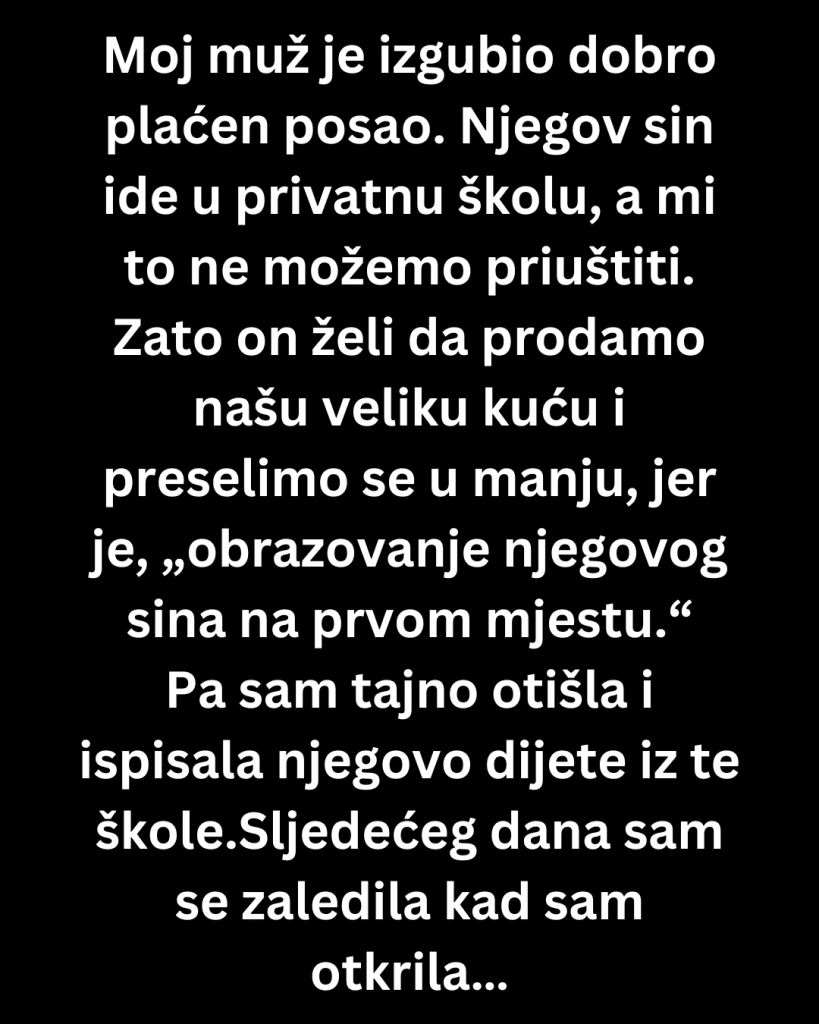 Sljedećeg dana, njegov sin je došao kući u suzama, drhteći. To je zato što sam ga tajno ispisala iz te skupe škole.