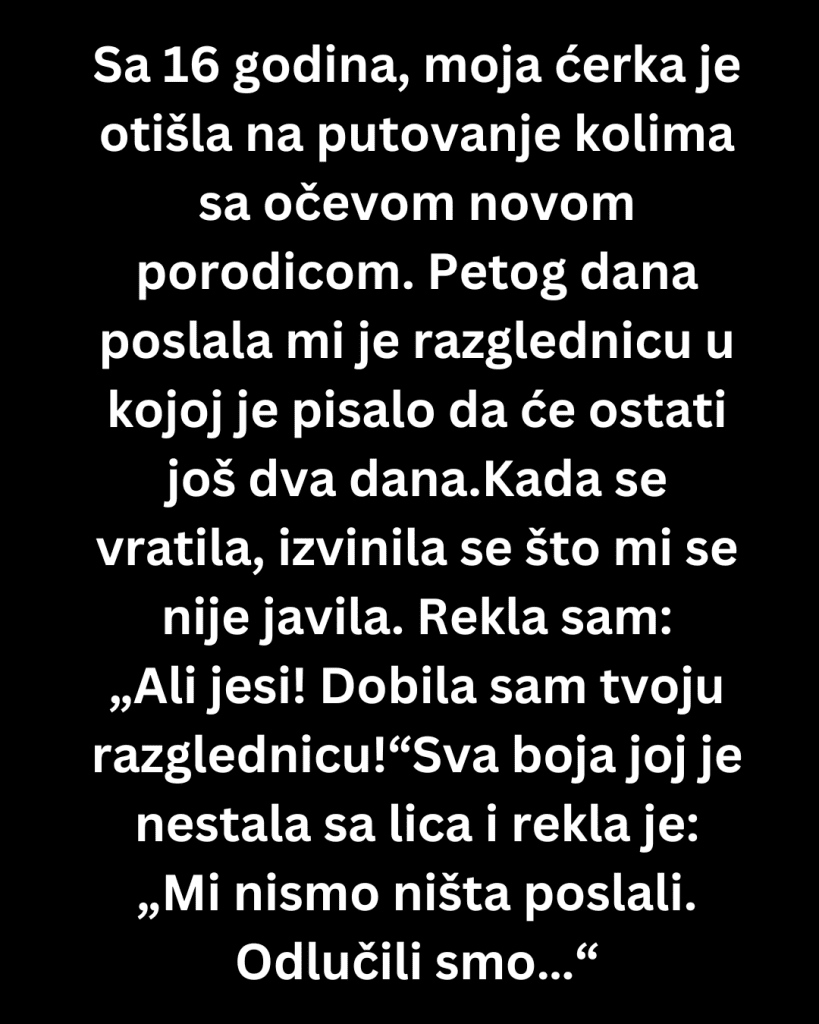 Ovo se desilo devedesetih, kada je moja ćerka imala 16 godina. Otišla je na putovanje kolima sa očevom novom porodicom. Petog dana dobila sam od nje razglednicu u kojoj je pisalo da će ostati još 2 dana. Kada se vratila, izvinila se što mi nije javila.