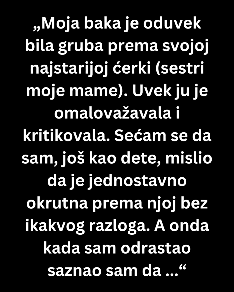 Jedne večeri, sasvim slučajno, čuo sam razgovor koji nisam trebao. Baka je mislila da je sama. Glas joj je bio tih, ali gorak. Tada sam prvi put saznao razlog zbog kojeg je cijelog života mrzila svoju najstariju kćerku.