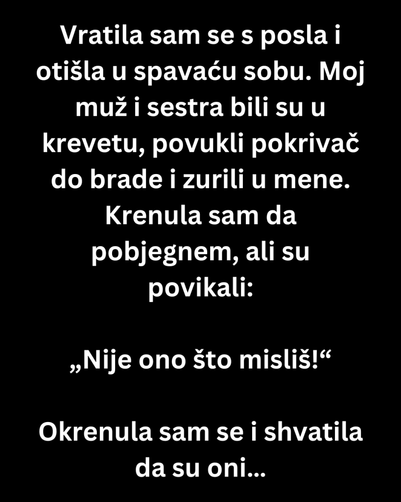 Vratila sam se s posla i ušla u spavaću sobu. Moj muž i sestra bili su u krevetu, povukli pokrivač do brade i zurili u mene. Krenula sam da pobjegnem, ali su povikali: „Nije ono što misliš!“