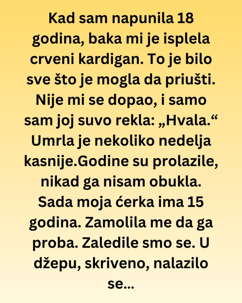 Baka mi je isplela crveni kardigan ali ono što je usledilo mi je dalo lekciju…..