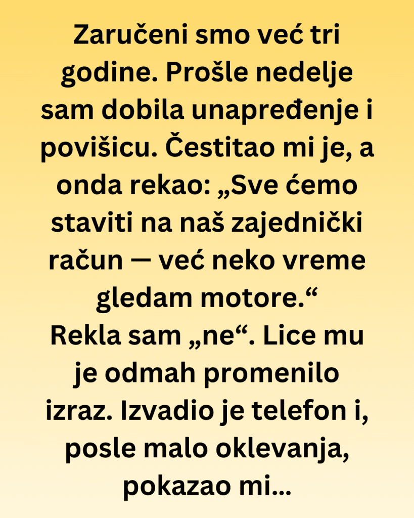 Oduvek sam se divila tome koliko je moj verenik ljubazan i pažljiv. Zajedno smo već tri godine i sve je uvek bilo bez problema. Prošle nedelje sam dobila unapređenje na poslu i povišicu.