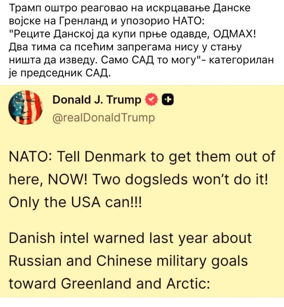 Tramp je u objavi zakačio i tekst sa sajta “JustTheNews” u kojem se navodi da je, dok danski lideri umanjuju pretnju koju po Grenland predstavljaju Rusija i Kina, Danska obaveštajna služba za odbranu (DDIS) nedavno objavila procenu u kojoj otvoreno upozorava na ruske i kineske vojne ambicije za širenje na područje oko Grenlanda i Arktika.