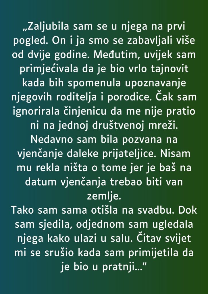 Tako sam sama otišla na svadbu. Dok sam sjedila, odjednom sam ugledala njega kako ulazi u salu.