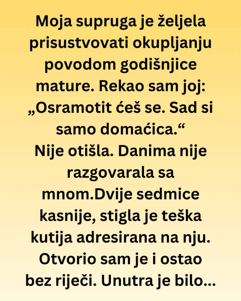 Dvije sedmice kasnije, stigla je teška kutija adresirana na nju. Otvorio sam je i ostao bez riječi. Unutra je bila uokvirena fotografija cijelog njenog razreda s mature, potpisana od svih.