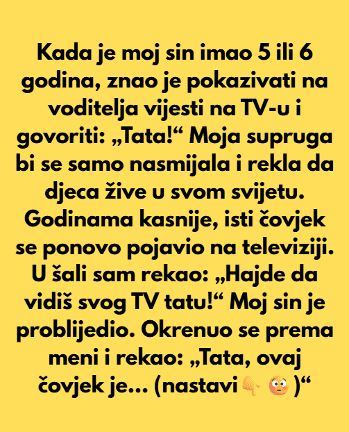 Godinama kasnije, isti taj voditelj ponovo se pojavio na TV ekranu. U šali sam rekao: „Hajde da vidiš svog TV tatu!“ Moj sin je problijedio, ali prije nego što je uspio nešto reći, moja supruga je iznenada počela kašljati i zamolila ga da joj donese čašu vode. Međutim, sin se okrenuo prema meni i rekao: „Vrijeme je da sazna istinu!“ Zatim je dodao: „Tata, ovaj čovjek je — ili je bio — mamin dečko. Kad sam bio mali, ona je išla da se viđa s njim i vodila je i mene.“
