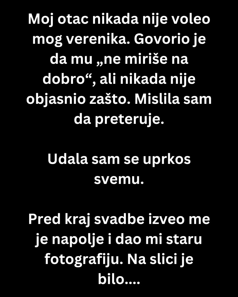 Pred kraj svadbe izveo me je napolje i dao mi staru fotografiju. Na slici — moj muž, mnogo mlađi, zagrljen sa ženom koja je neverovatno ličila na mene.