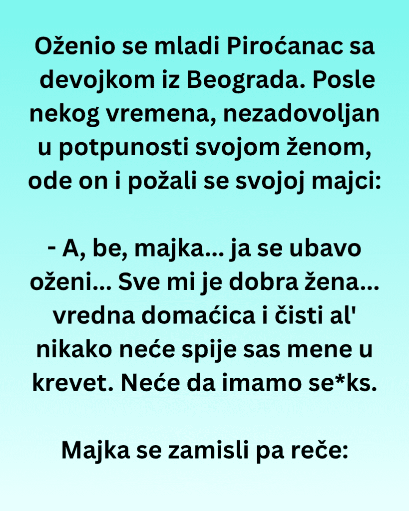 - A, be, majka… ja se ubavo oženi… Sve mi je dobra žena… vredna domaćica i čisti al’ nikako neće spije sas mene u krevet. Neće da imamo se*ks.
