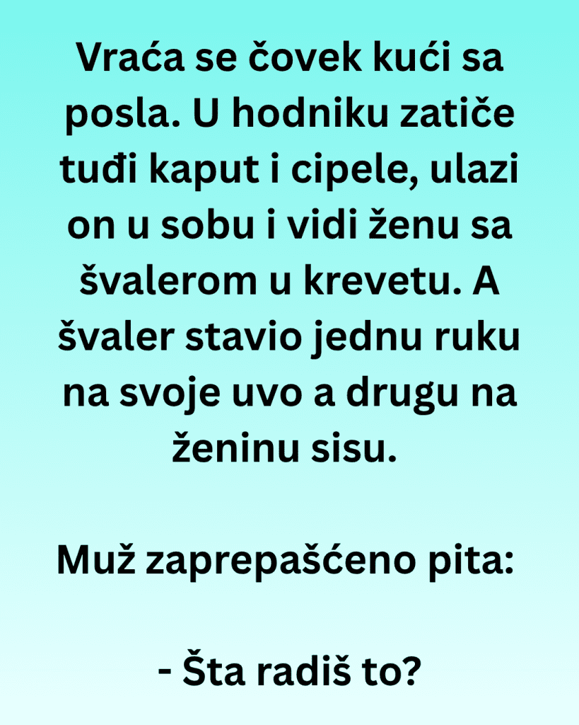 Vraća se čovek kući sa posla. U hodniku zatiče tuđi kaput i cipele, ulazi on u sobu i vidi ženu sa švalerom u krevetu. A švaler stavio jednu ruku na svoje uvo a drugu na ženinu sisu. Muž zaprepašćeno pita: – Šta radiš to?