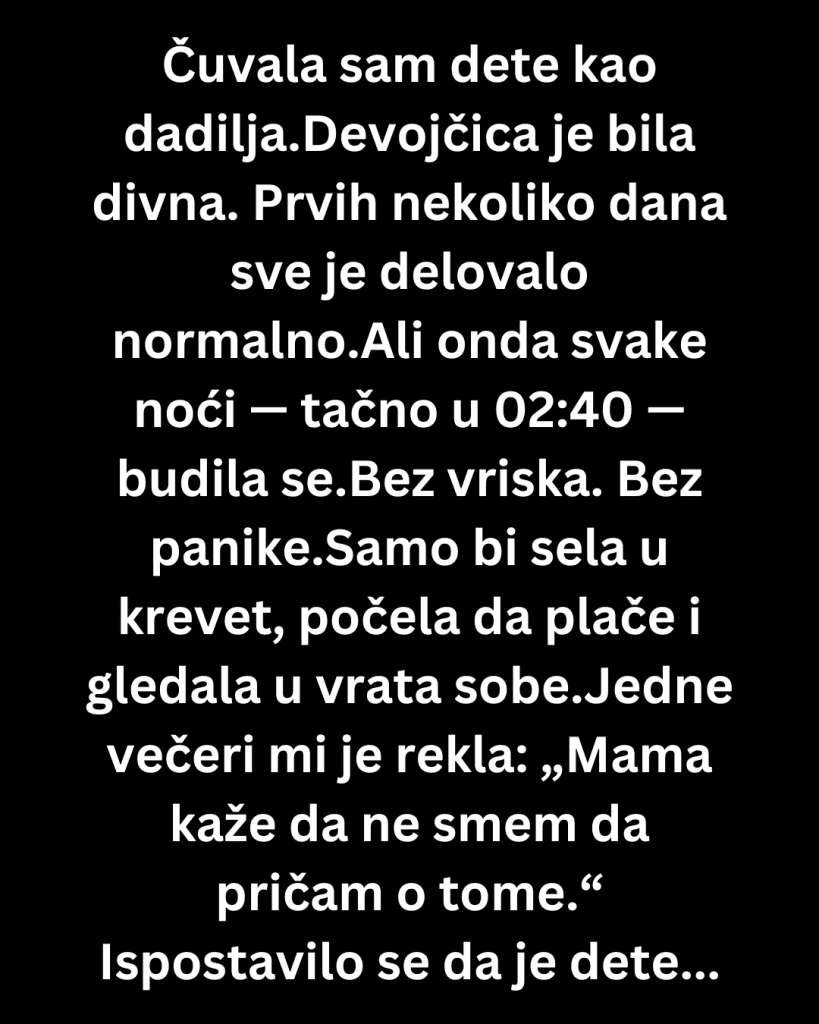 Devojčica je imala šest godina. Bila je nežna, pametna i previše tiha za svoje godine. Roditelji su mi rekli da je „malo osetljiva“ i da ponekad ima ružne snove. Nisam sumnjala u to — mnoga deca prolaze kroz takve faze. Prvih nekoliko dana sve je delovalo normalno, ali sam brzo primetila nešto čudno: svake noći, tačno u 02:40, budila se. Bez vriska i panike — samo bi sela u krevet, počela da plače i gledala u vrata sobe, kao da nešto očekuje ili se nečega boji.