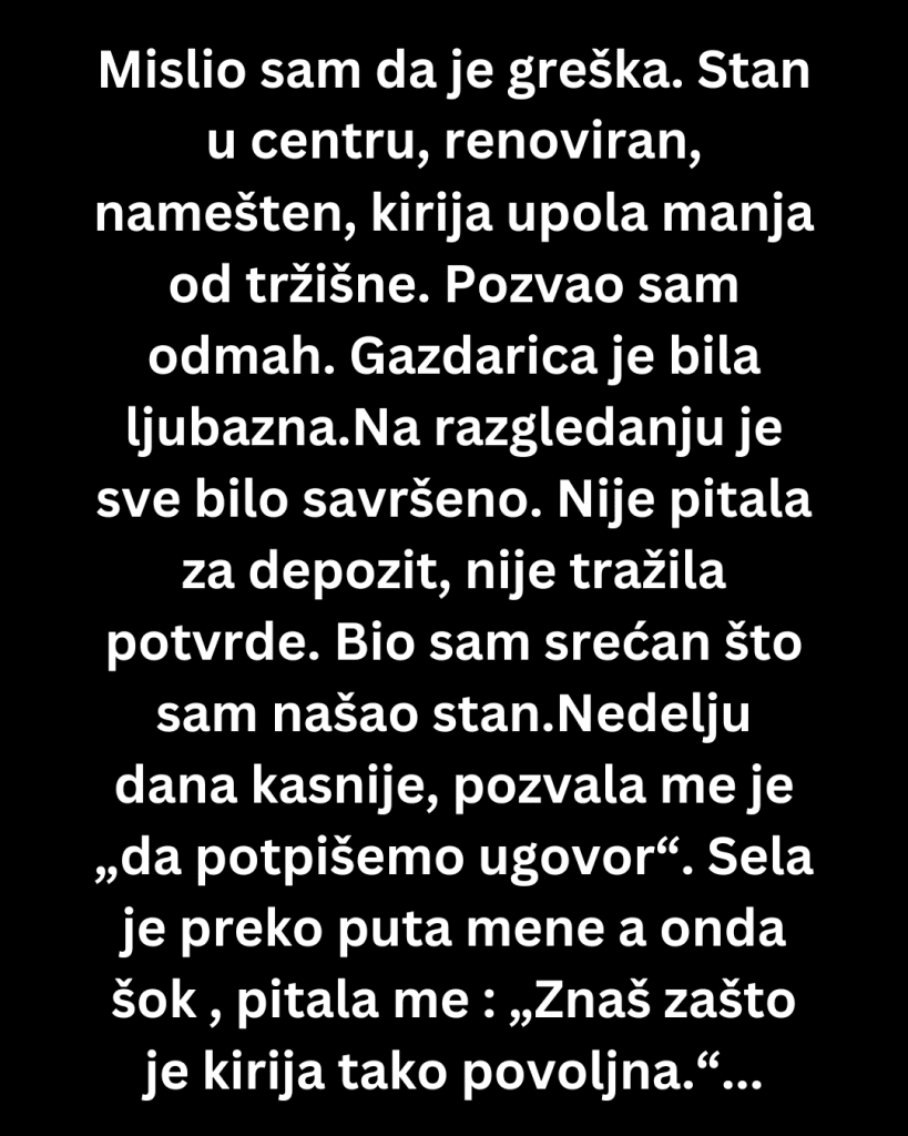 Kada sam video oglas, pomislio sam da je greška. Stan u centru, renoviran, namešten, kirija upola manja od tržišne. Pozvao sam odmah. Gazdarica je bila ljubazna, smirena, rekla je da joj je važno da u stanu bude „pristojan i pouzdan čovek“.