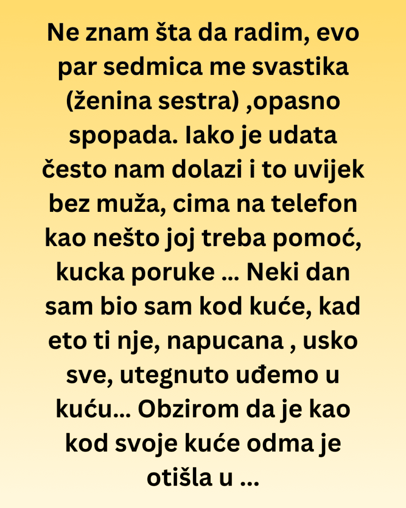 Ne znam šta da radim, evo par sedmica me svastika (ženina sestra) , koja je starija od nas 10 godina,opasno spopada. Iako je udata često nam dolazi i to uvijek bez muža, cima na telefon kao nešto joj treba pomoć, kucka poruke na facebooku…