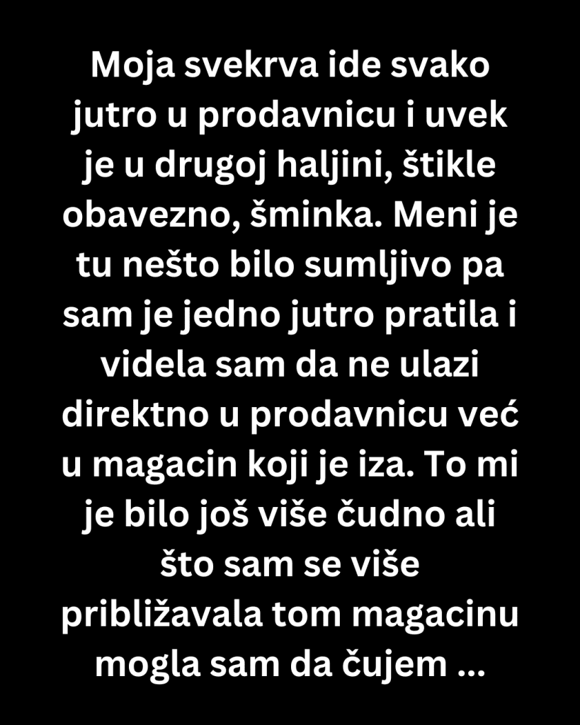 Moja svekrva je svako jutro išla u prodavnicu, uvek sređena kao da ide na proslavu: druga haljina, štikle, šminka besprekorna. U početku mi je to bilo čak simpatično, ali vremenom mi je postalo sumnjivo. Niko se tako ne doteruje da bi kupio hleb, i to baš svakog jutra u isto vreme. Jednog dana sam odlučila da je pratim. Krenula sam par minuta posle nje i pazila da me ne primeti.