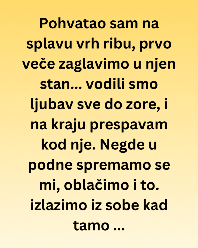 Pohvatao sam na splavu vrh ribu, prvo veče zaglavimo u njen stan… vodili smo ljubav sve do zore, i na kraju prespavam kod nje. Negde u podne spremamo se mi, oblačimo i to. izlazimo iz sobe kad tamo u dnevnoj sobi sedi čovek. U trenerci, sa kafom u ruci, gleda nas kao da je prizor koji vidi potpuno normalan. Ja se ukočim, ona isto. U glavi mi prolazi sto scenarija u sekundi: muž, dečko, bivši, neko ko će sada da napravi haos.