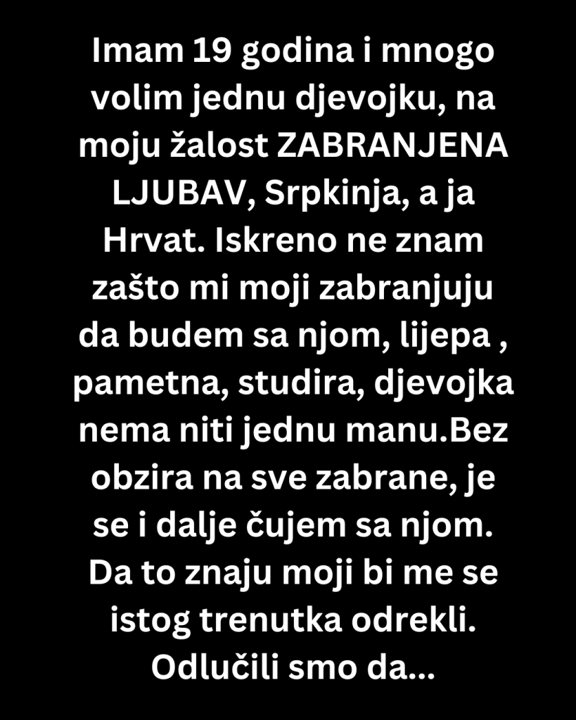Imam 19 godina i mnogo volim jednu djevojku. Na moju žalost – zabranjena ljubav. Ona je Srpkinja, ja Hrvat. Iskreno, nikada nisam shvatio zašto je to problem. Za mene je ona samo djevojka u koju sam se zaljubio. Lijepa kao Bog, pametna, studira, vaspitana, topla… nema niti jednu manu. Bar ne onu koju bi normalan čovjek mogao navesti kao razlog da je ne voli.