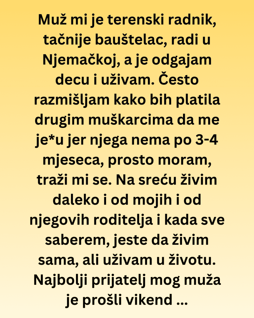 Muž mi je terenski radnik, tačnije bauštelac, radi u Njemačkoj, a je odgajam decu i uživam. Često razmišljam o drugim muškarcima jer njega nema po 3-4 mjeseca, prosto imam potrebe. Na sreću živim daleko i od mojih i od njegovih roditelja i kada sve saberem, jeste da živim sama, ali uživam u životu. Najbolji prijatelj mog muža je prošli vikend pokucao na vrata.