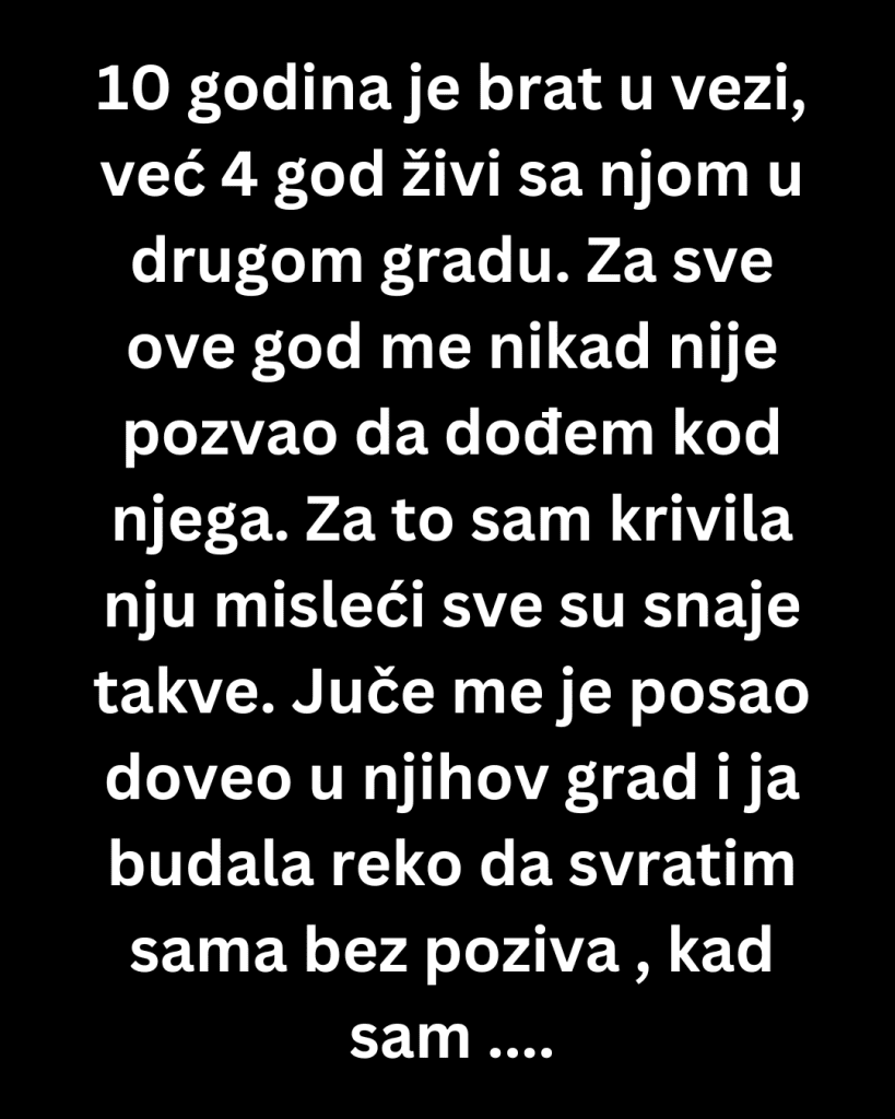 Deset godina je moj brat u vezi, već četiri živi sa njom u drugom gradu. Za sve te godine nikada me nije pozvao da dođem kod njega. Uvek sam to pripisivala njoj, misleći kako su sve snaje iste, da ne žele muževu porodicu blizu, da drže distancu. U glavi sam stvorila sliku žene koja ga odvaja od nas, i priznajem — nosila sam tiho ogorčenje prema njoj.