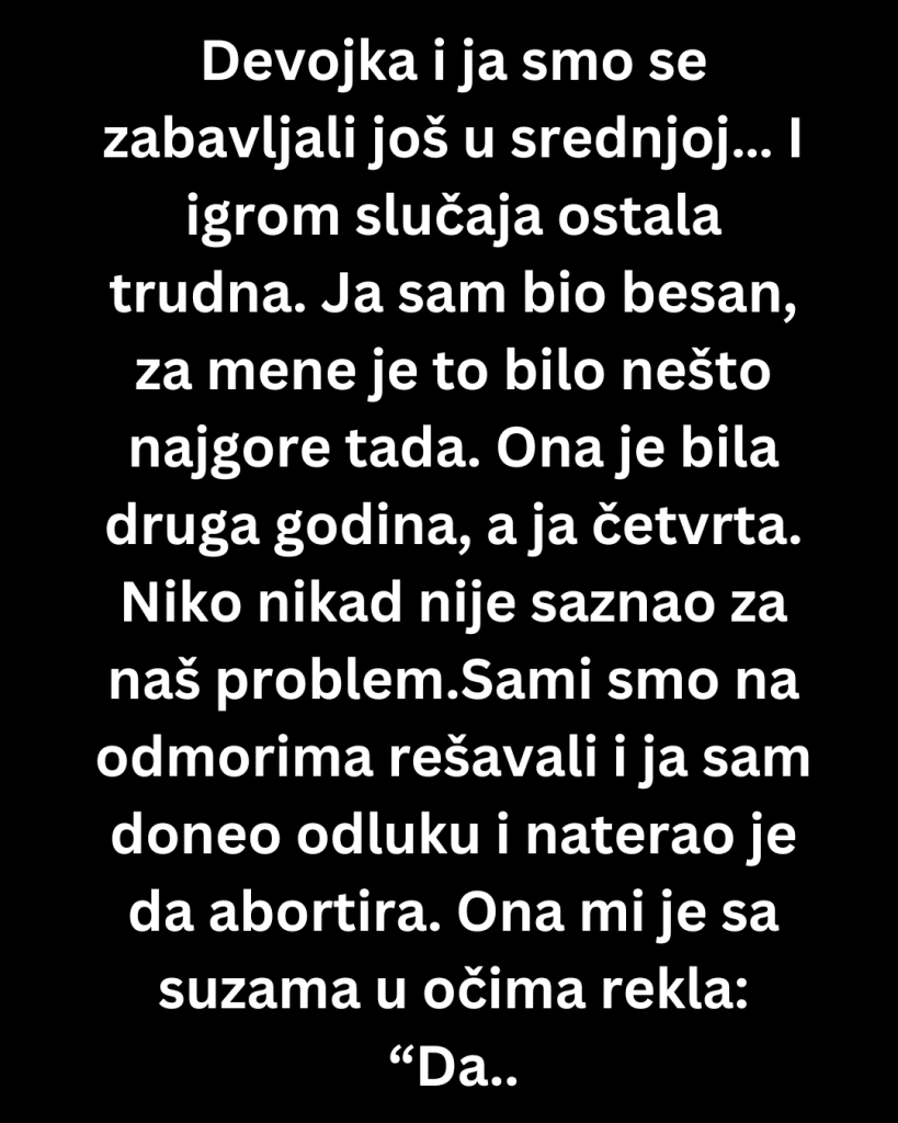 Devojka i ja smo se zabavljali još u srednjoj… Bili smo godinu dana u vezi i ona je igrom slučaja ostala trudna. Ja sam bio besan, za mene je to bilo nešto najgore tada… Ona je bila druga godina, a ja četvrta. Niko nikad nije saznao za naš problem.