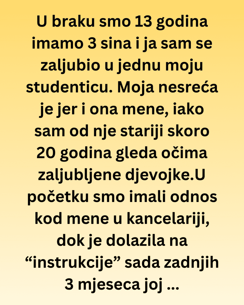 U braku smo 13 godina imamo 3 sina i ja sam se zaljubio u jednu moju studenticu. Moja nesreća je jer i ona mene, iako sam od nje stariji skoro 20 godina gleda očima zaljubljene djevojke.