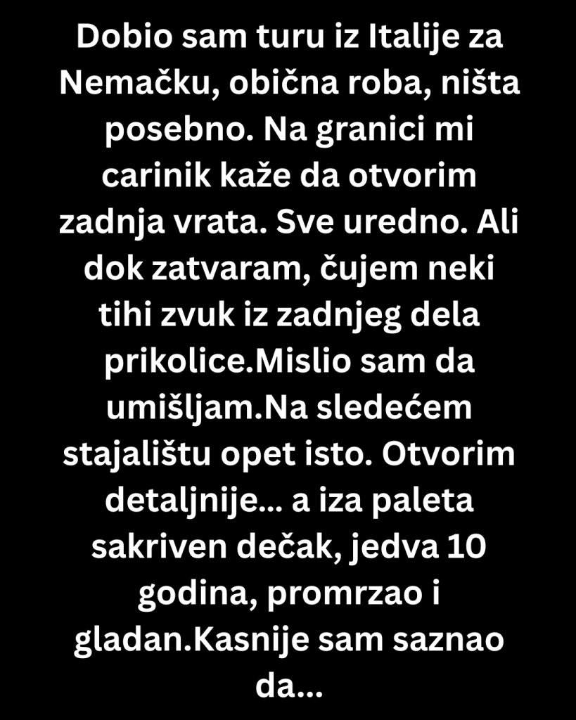 Vozio sam u životu i skupu robu, i mašine, i teret koji vredi milione. Ali taj mali, uplašeni klinac iza palete bio je najskuplji teret koji sam ikad vozio — jer sam tada shvatio da ponekad u prikolici ne nosiš samo robu, nego nečiji očaj i poslednju nadu.