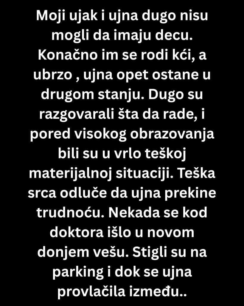 Radost se brzo pretvorila u brigu. Iako su oboje bili visoko obrazovani, u tom trenutku su živeli veoma teško — krediti, podstanarski život, mala plata, beba u kući. Noćima su razgovarali šta da rade. Vagali su, računali, pokušavali da nađu rešenje, ali sve ih je vodilo na isto mesto. Teška srca odluče da ujna prekine trudnoću. Govorili su sebi da će kasnije, kad stanu na noge, pokušati ponovo.
