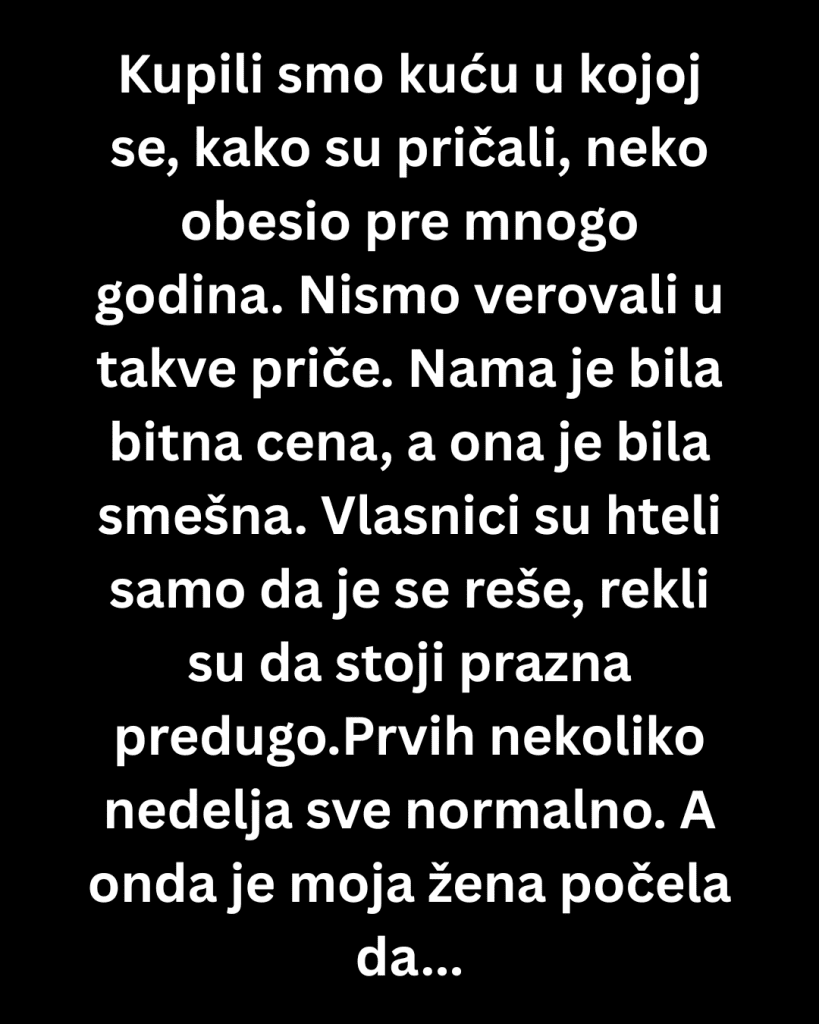 Kupili smo kuću u kojoj se, kako su pričali, neko obesio pre mnogo godina. Nismo verovali u takve priče. Nama je bila bitna cena, a ona je bila smešna. Vlasnici su hteli samo da je se reše, rekli su da stoji prazna predugo. Rekli smo sebi da su to samo seoske priče koje ljudi vole da prepričavaju.