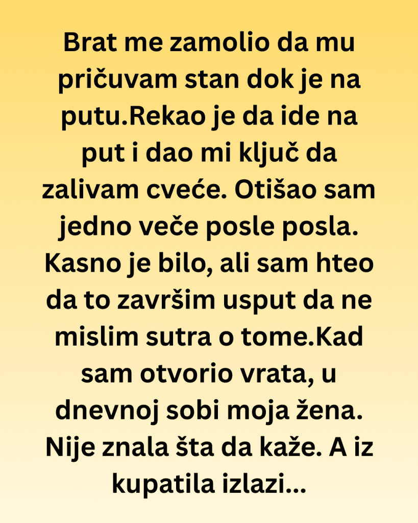 Brat me zamolio da mu pričuvam stan dok je na putu. Rekao je da ide službeno na nekoliko dana i da samo svratim povremeno da zalijem cveće i proverim da li je sve u redu. Dao mi je ključ bez mnogo priče. Nikad nisam ni pomislio da u tome može biti nešto čudno — bio mi je rođeni brat, čovek kome sam verovao više nego sebi.