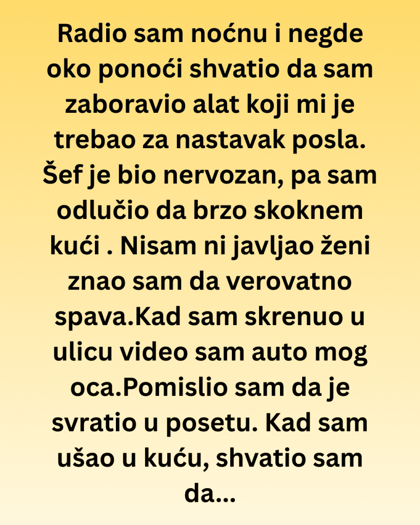 Radio sam noćnu smenu i negde oko ponoći shvatio da sam zaboravio alat koji mi je trebao za nastavak posla. Šef me već čekao nervozan, pa sam odlučio da brzo skoknem kući i uzmem ga. Nisam ni javljao ženi — znao sam da verovatno spava.
