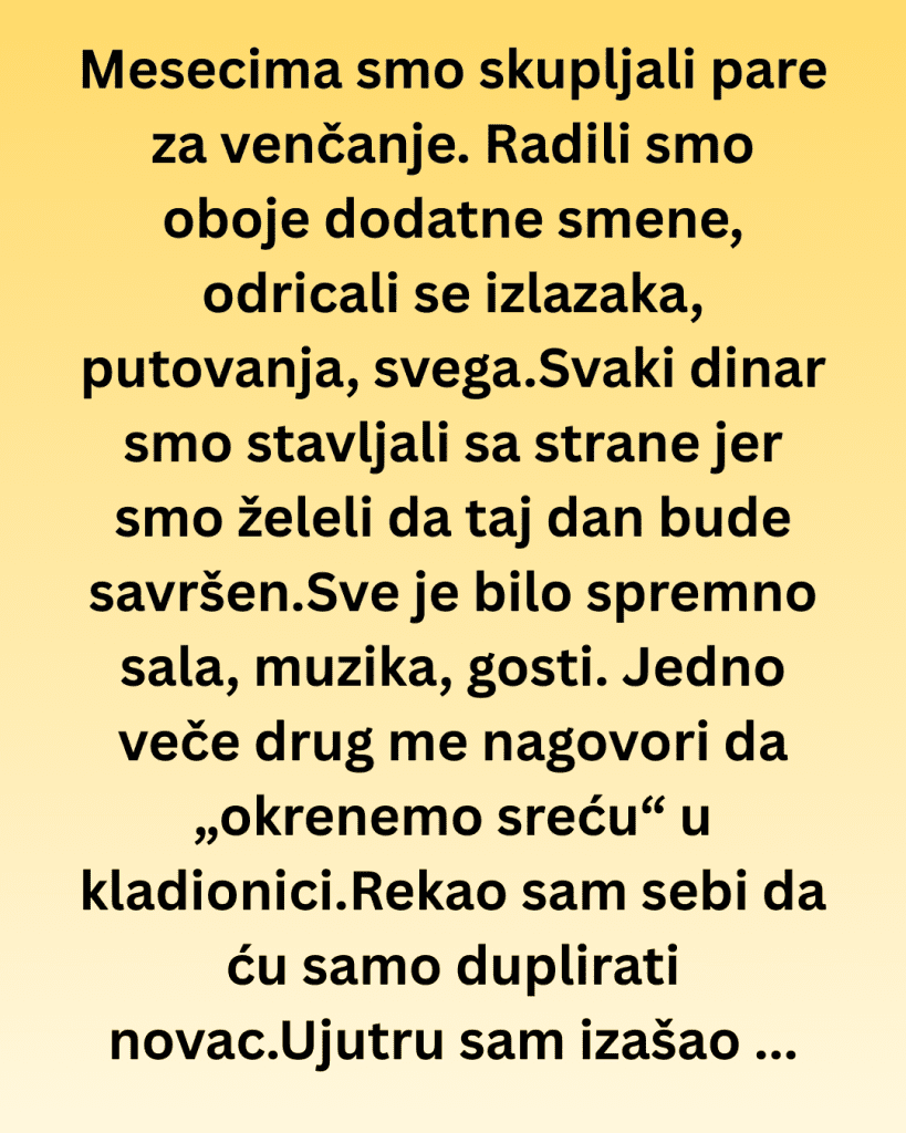 Mesecima smo skupljali pare za venčanje. Radili smo oboje dodatne smene, odricali se izlazaka, putovanja, svega. Svaki dinar smo stavljali sa strane jer smo želeli da taj dan bude savršen. Sala rezervisana, muzika kaparisana, pozivnice već podeljene.