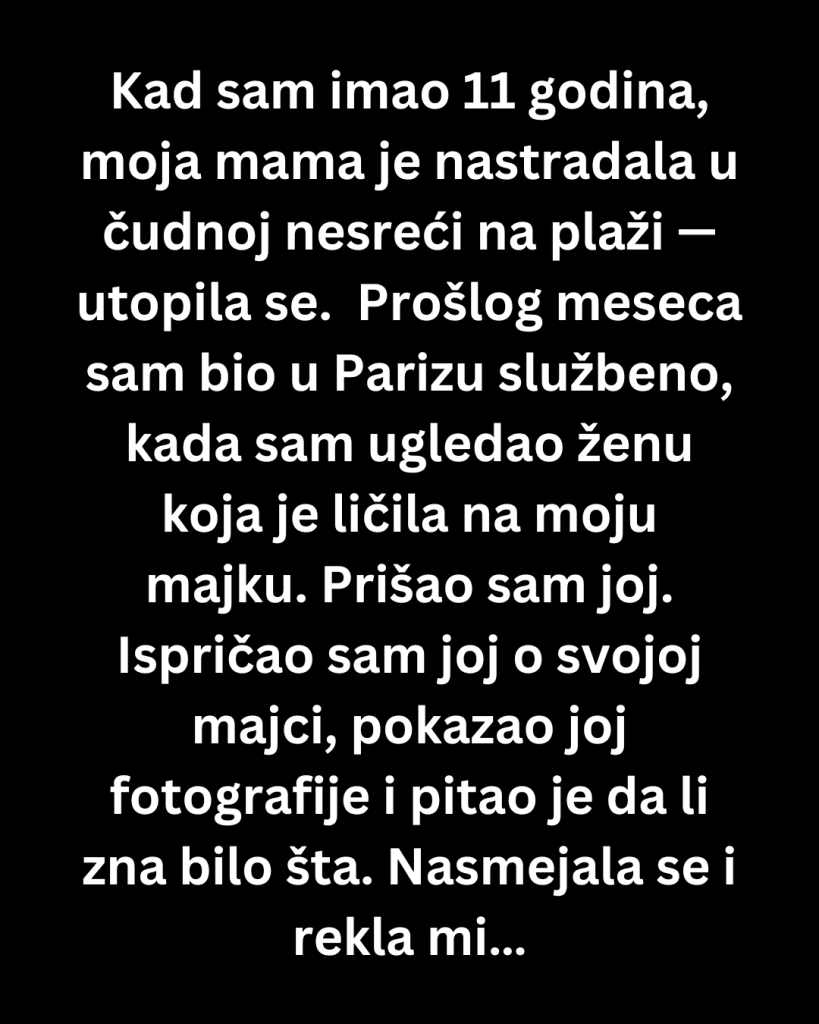 Prošlog meseca bio sam u Parizu zbog posla kada sam ugledao ženu koja je ličila na moju majku. Prišao sam joj. Ispričao sam joj o svojoj majci, pokazao joj fotografije i pitao je da li zna bilo šta.