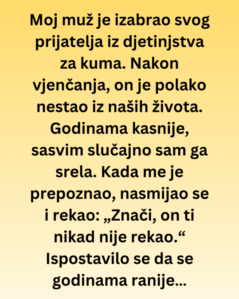 Moj muž je izabrao svog prijatelja iz djetinjstva za kuma. Nakon vjenčanja, taj prijatelj je polako nestao iz naših života. Prestali su se čuti. Moj muž je govorio da se ljudi jednostavno vremenom udalje.