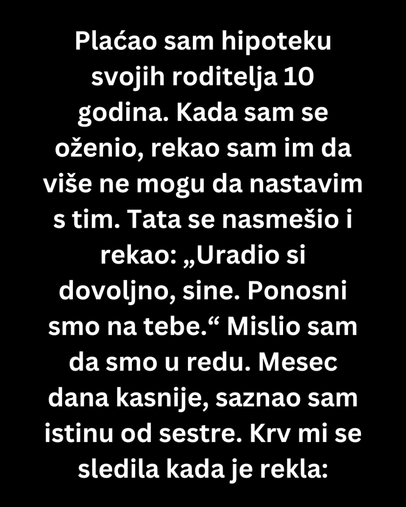 Plaćao sam hipoteku svojih roditelja 10 godina. Kada sam se oženio, rekao sam im da više ne mogu da nastavim. Tata se nasmešio i rekao: „Uradio si dovoljno, sine. Ponosni smo na tebe.“ Mislio sam da smo u redu.Hipotekarni kalkulator