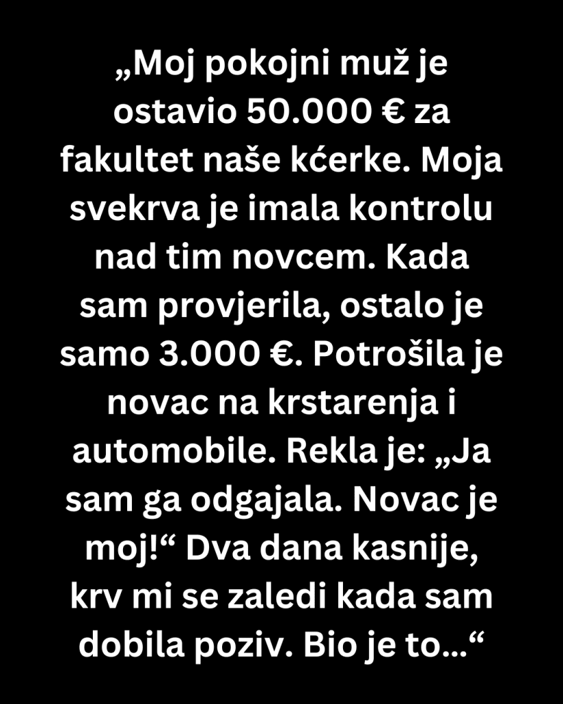 Evo gdje stvari postaju zamršene. Moja svekrva je nekako dobila kontrolu nad tim računom. Tada sam bila u žalosti, preplavljena i vjerovala sam joj. Stalno je govorila: „Ne brini, ja to držim pod kontrolom.“