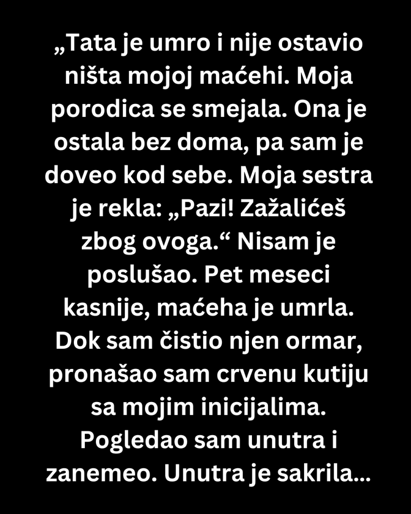Pet meseci kasnije, maćeha je umrla. Dok sam čistio njen ormar, pronašao sam crvenu kutiju sa mojim inicijalima. Pogledao sam unutra i zanemeo. Unutra je sakrila gomilu pravnih dokumenata — vlasničke listove koje je krila tokom 16 godina braka sa našim ocem. Kuću. Parcela zemlje. Nikada nije rekla ni reč o tome. Gledao sam u papire, jedva shvatajući šta držim u rukama.