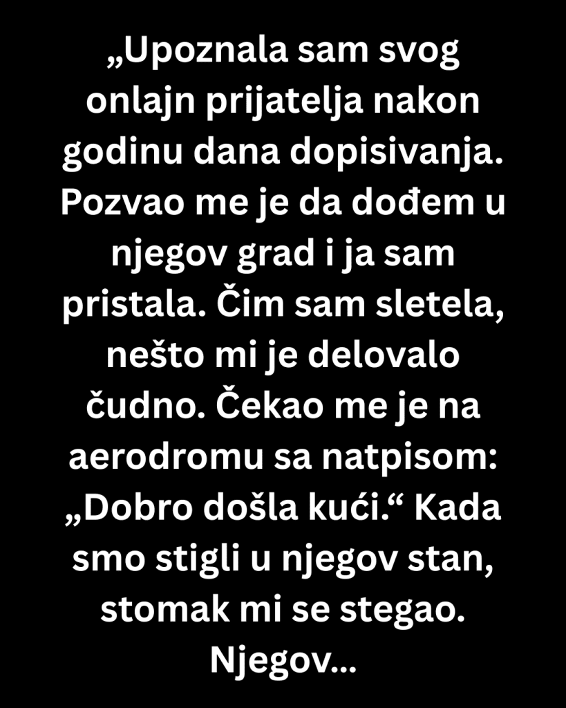 Upoznala sam svog onlajn prijatelja nakon godinu dana dopisivanja. Pozvao me je da dođem u njegov grad i ja sam pristala. Kada sam sletela, nešto mi je odmah delovalo pogrešno. Čekao me je na aerodromu sa natpisom: „Dobro došla kući.“