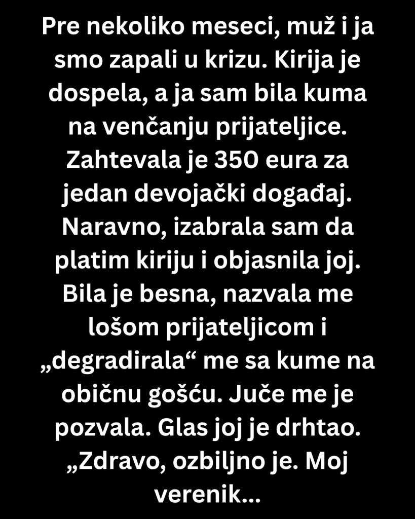 Juče me je pozvala. Glas joj je drhtao. „Zdravo, ozbiljno je. Moj verenik i ja moramo da pozajmimo nešto novca. Znam da se dugo nismo čule, ali ti si jedina koja može da nam pomogne.“ Ispostavilo se da su oboje dobili otkaz i da su se davili u dugovima. Ista ona prijateljica koja me je nekada ponižavala jer nisam htela da trošim novac na njen događaj sada nije imala kome da se obrati.