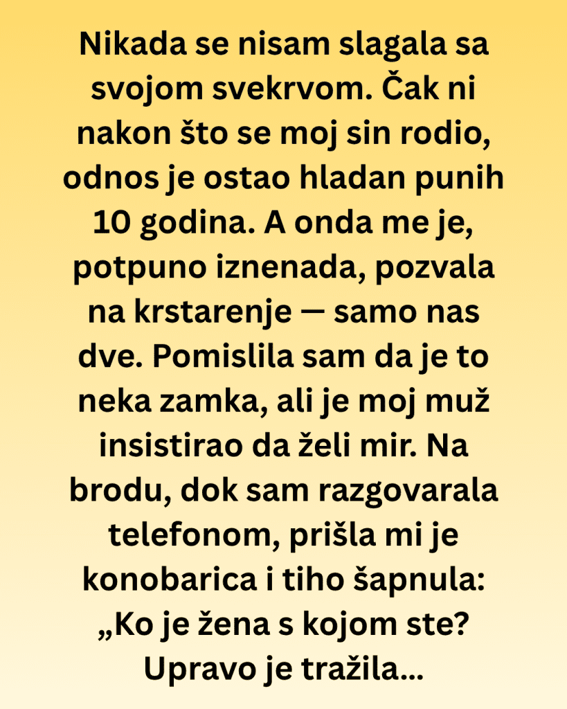 Nikada se nisam slagala sa svojom svekrvom. Čak ni nakon što se moj sin rodio, odnos je ostao hladan punih 10 godina. A onda me je, potpuno iznenada, pozvala na krstarenje — samo nas dve. Pomislila sam da je to neka zamka, ali je moj muž insistirao da želi mir.