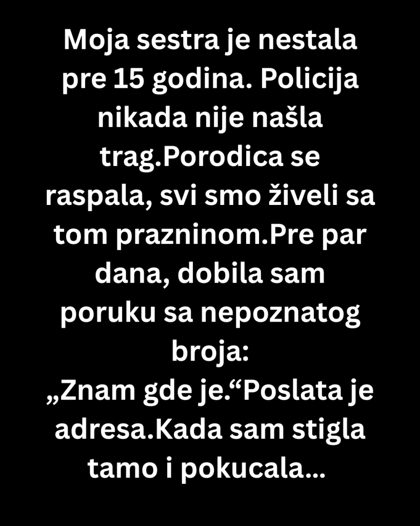 Godine su prolazile i naučila sam da živim sa tim, ili sam bar mislila da jesam. A onda, pre nekoliko dana, stigla mi je poruka sa nepoznatog broja. Pisalo je samo: „Znam gde je.“ U sledećoj poruci bila je adresa. Bez objašnjenja, bez potpisa. Pokušala sam da pozovem broj, ali nije bio dostupan. Nisam mogla da čekam, odmah sam sela u auto i krenula.