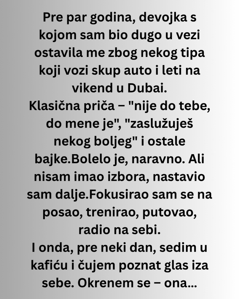 I onda, pre neki dan, sedim u kafiću i čujem poznat glas iza sebe. Okrenem se – ona. Ali ne sama. Sedi sa drugaricom i priča joj kako ju je onaj “savršen” ostavio bez dinara, prevario, i još blokirao svuda.