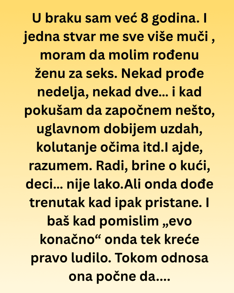 U braku sam već 8 godina. Nije da nemamo problema kao i svi, ali jedna stvar me sve više muči — osećam se kao da moram da molim rođenu ženu za bliskost. Nekad prođe nedelja, nekad dve… i kad pokušam da započnem nešto, uglavnom dobijem uzdah, kolutanje očima ili rečenicu tipa „umorna sam“.